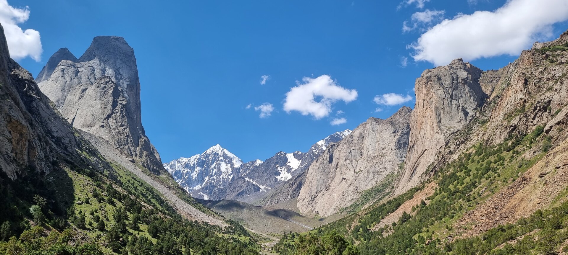 Будем идти в окружении километровых скальных стен, не зря этот район называют "страной больших стен". Район очень популярен у скалолазов и альпинистов: Желтая стена (3800м), пик Асан (4230м), пик Усен (4378м), пик Одессы (4810м) – известны на весь альпинистский мир.